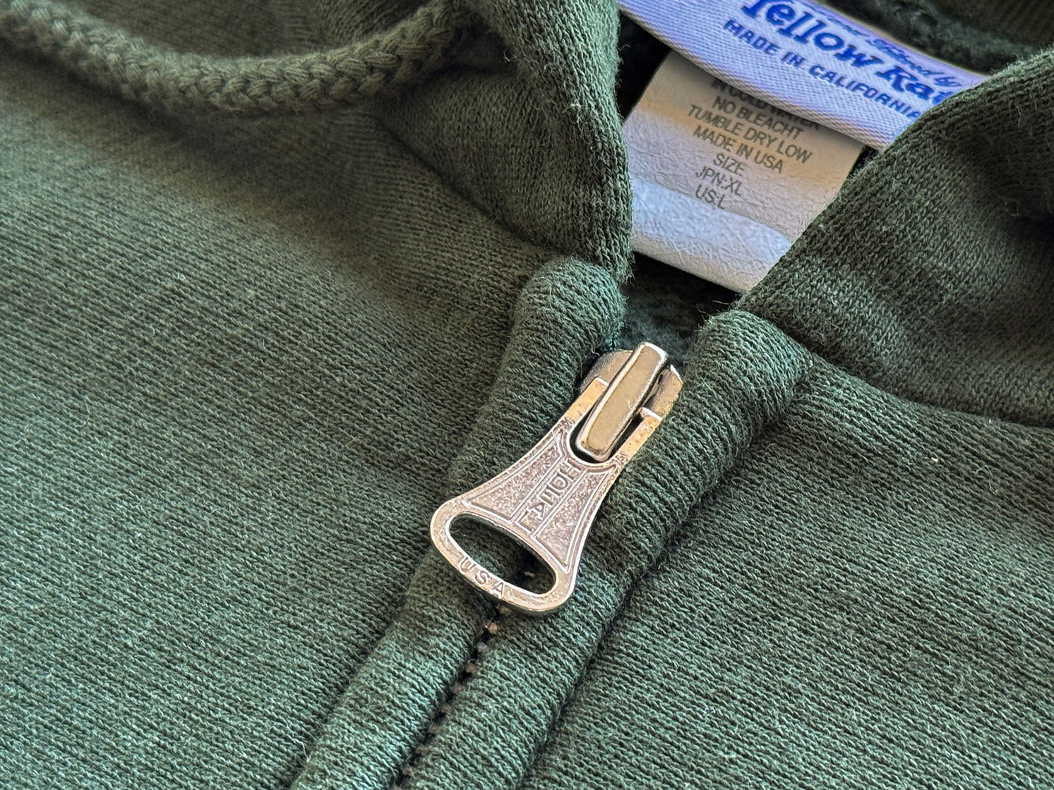 10oz hooded sweatshirt made in the U.S.A. Slightly rough texture gives real retro feel. It's fleece with reverse stitch that resists vertical shrinkage so the length stays true to size after wash. Gussets were used at underarms and armpit, rhomboid pieces of fabric inserted into a seam to add breadth and reduce stress from tight-fitting clothing. It features flat seam. 4" rib knit bottom and epolet shoulder raglan sleeves are truly straight out of late 50s–early 60s style.